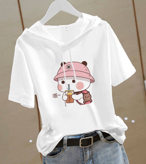 韩国上衣女士印花女士T恤宽松短袖休闲上衣女士衬衫女士时尚上衣夏季女士白色上衣短袖连帽衫